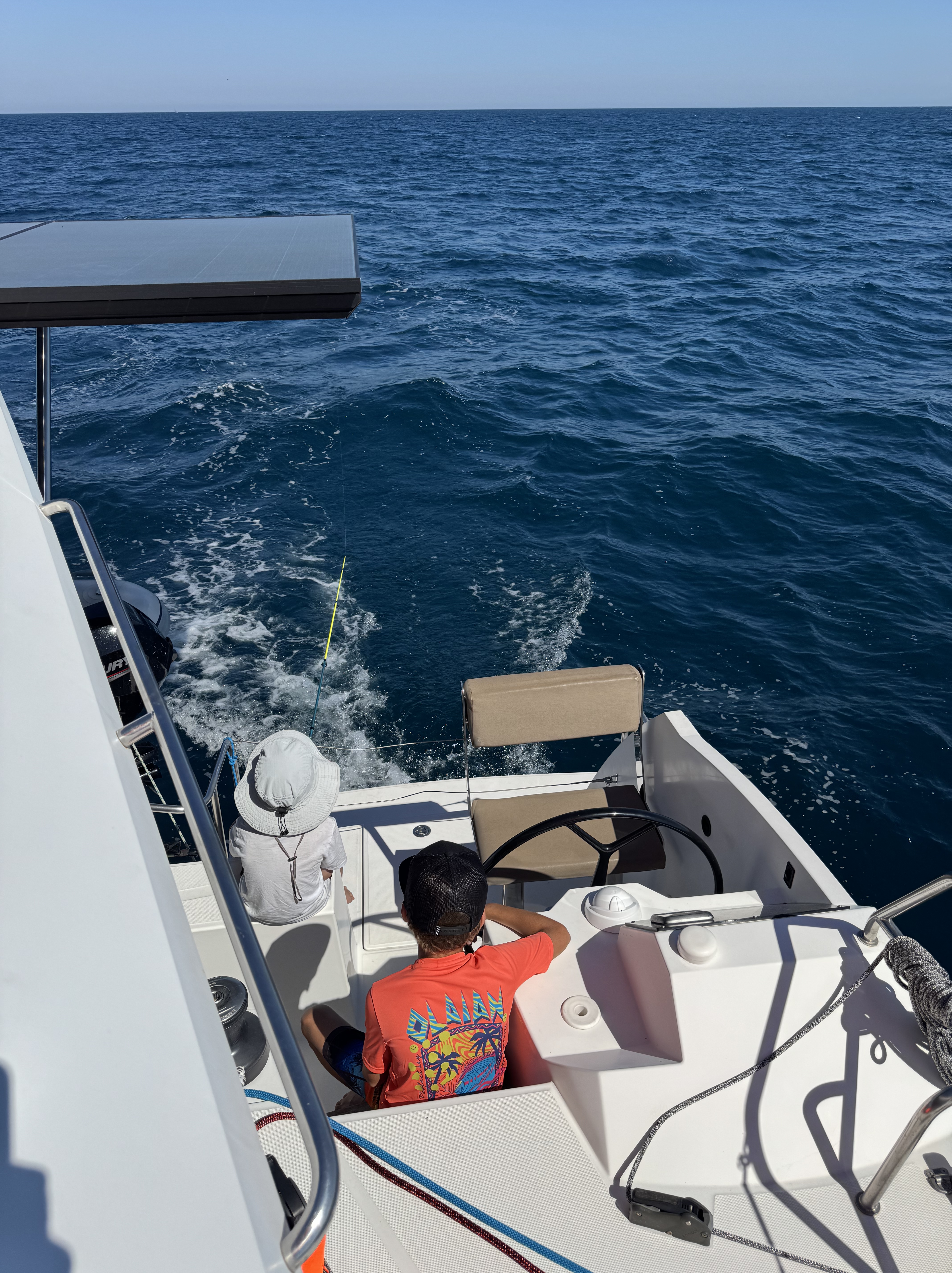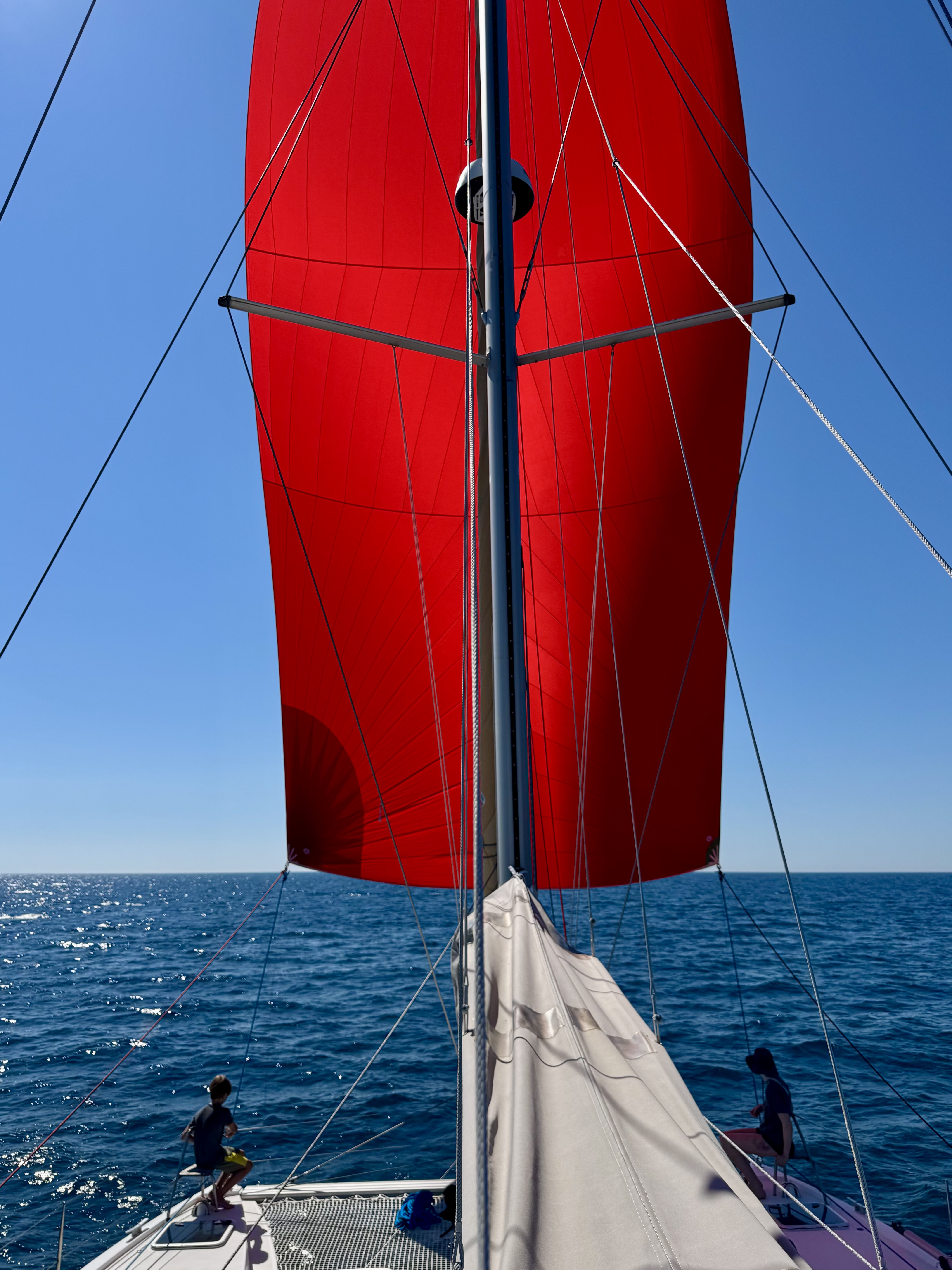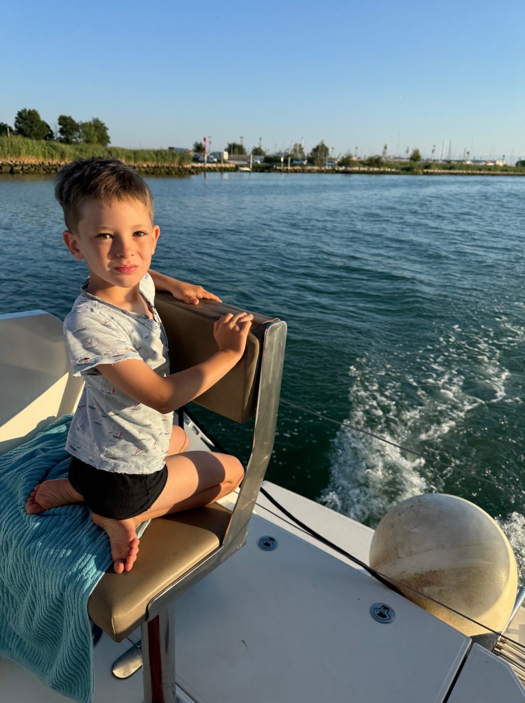 Our first leg was a gentle hop down just south of Rovinj for the night, before catching a full-blown Bora the next day — gusting 35 knots — to the bay of Banjole/Fašker, a place we’ve stopped many times before. The wind gave us a perfect chance to test the new genoa, and what can I say… Captain Mark has done it again. By re-rigging our Nautitech to fly a genoa instead of the self-tacking jib, he’s turned her into a whole new animal under sail. This was no small feat — sourcing parts, mounting new rails on the roof, even arranging for two sails from South Africa. (Why two? Ah… that’s a story we hope to share somewhere mid-Atlantic!)