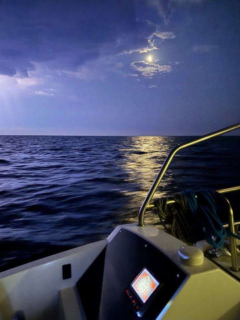 By nightfall, however, spirits were high again, and we shared a lasagna dinner before darkness settled in. Mark took the first watch from 10 p.m. to 2 a.m., passing through flashes of distant lightning—thankfully without any accompanying thunderstorms. I came on at 2 a.m., joined later by Laura and Jonas. With little happening, I let them keep lookout while I stayed nearby, ready if needed.