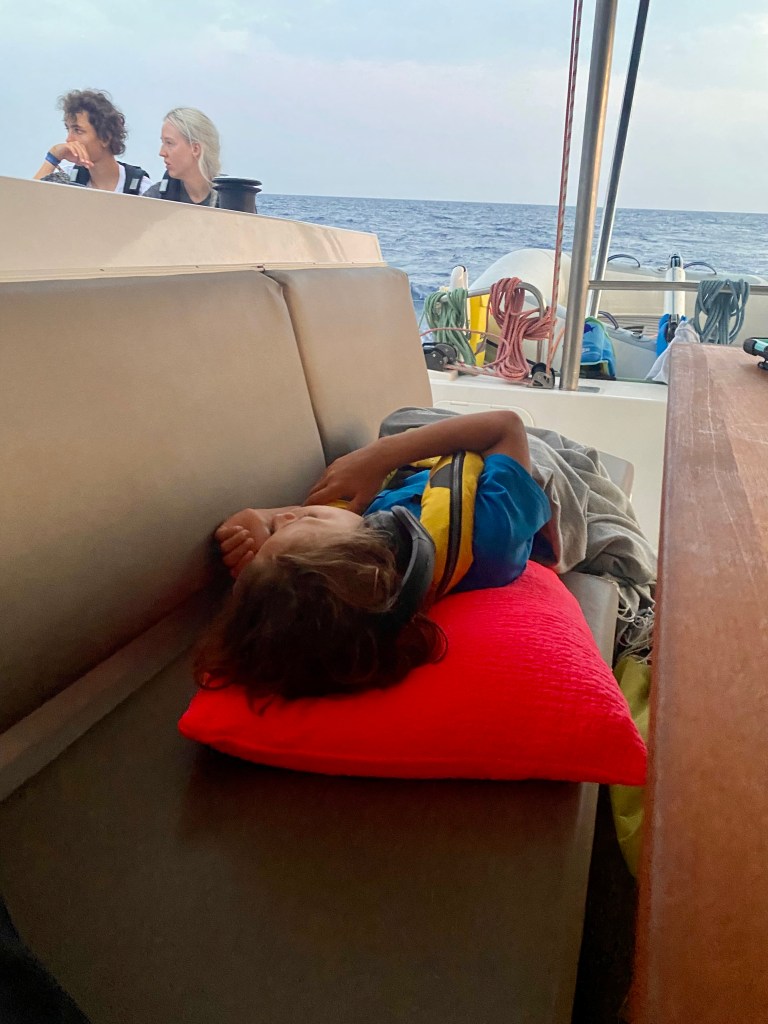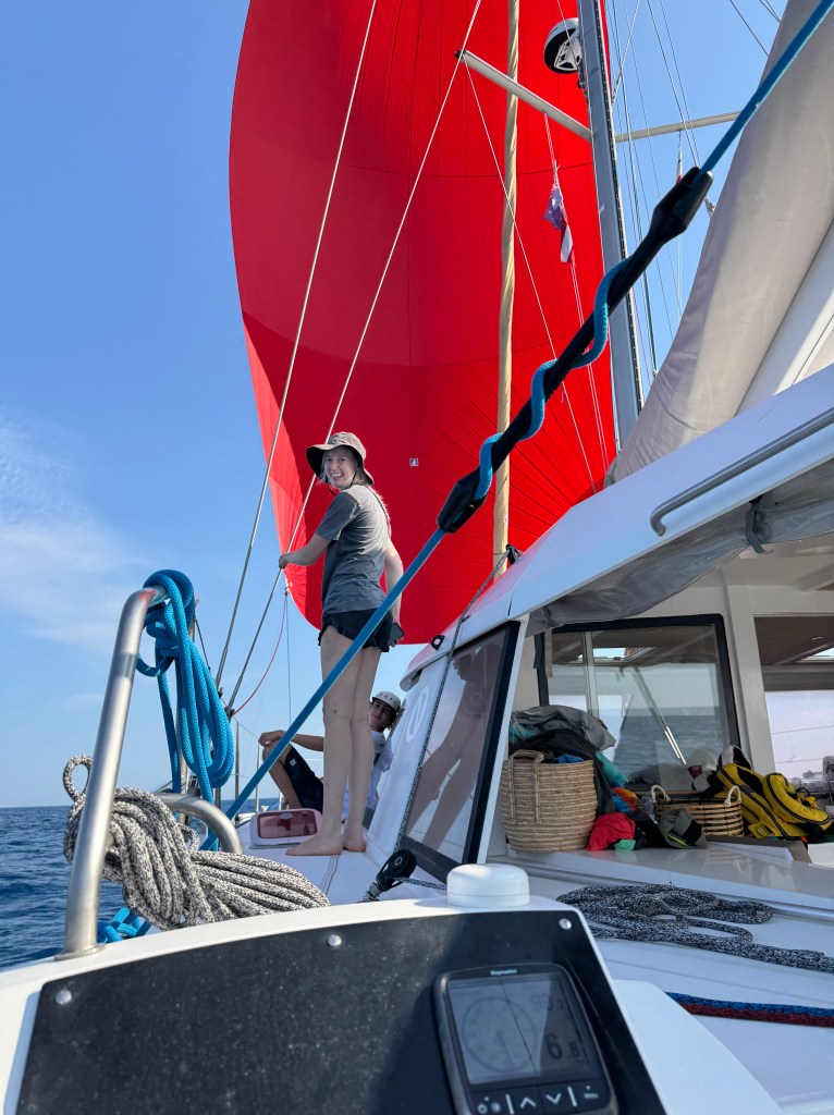 Day three, too, began gently and calmly. Then, just before sunset, Neptune gifted us with perfect spinnaker conditions: flat seas, doing easy 7–7.5 knots, and a roast dinner enjoyed under sail. Pure bliss.