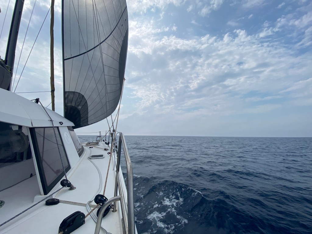 It turned out to be a good decision. A couple of hours later, we hoisted the spinnaker, which carried us calmly down past Kornat and onward toward the Italian coast. Still, the motion of the catamaran takes some getting used to, and combined with the muggy heat, it left a few of the crew feeling a little queasy.