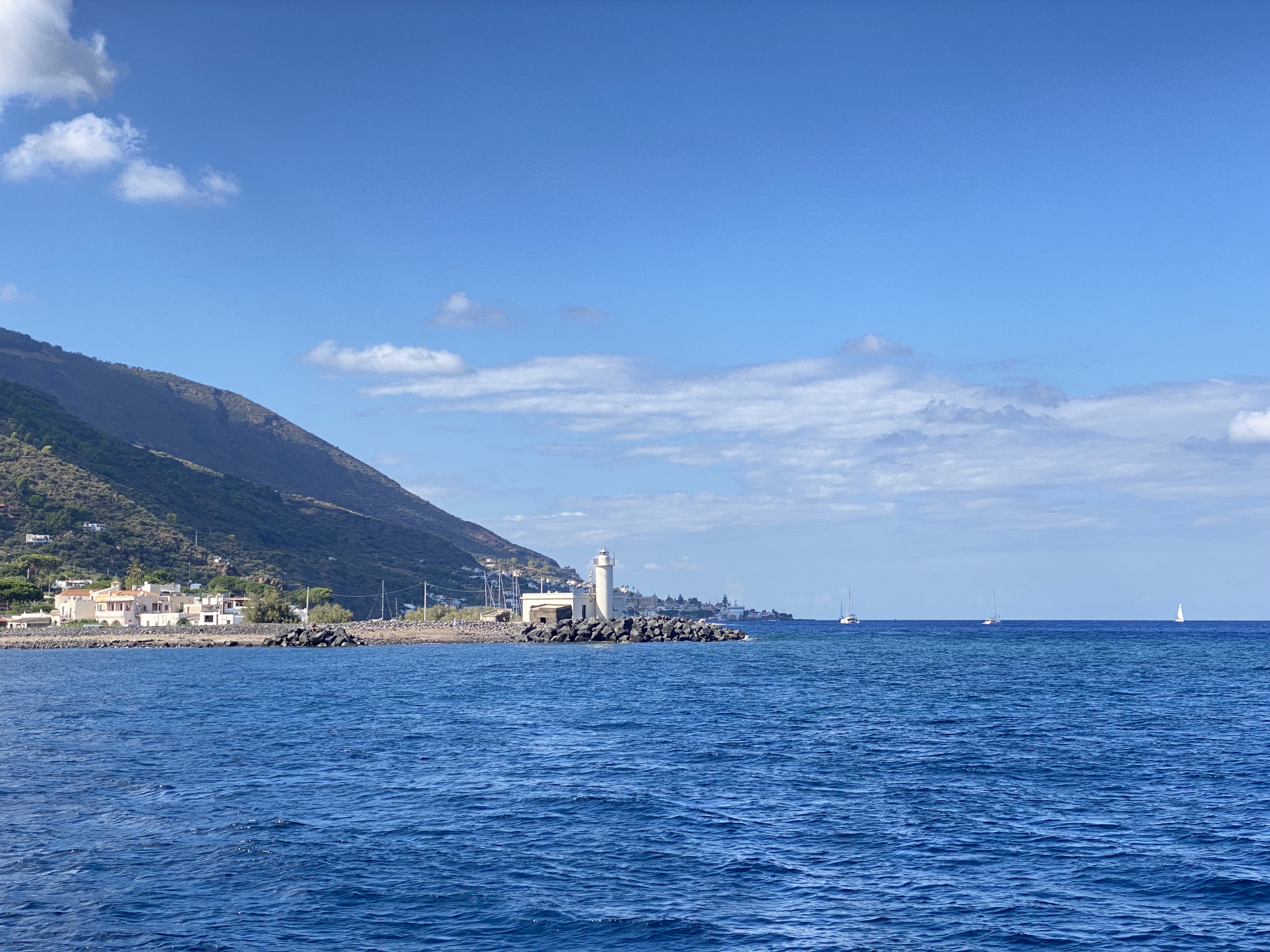 We left the “smelly eggs” behind and continued on to one of the most unique anchorages in the Aeolian Islands — right in front of the old pumice mines of Lipari. Clear water, crumbling ruins, floating rocks… and, in the distance, Stromboli. What a scene.
