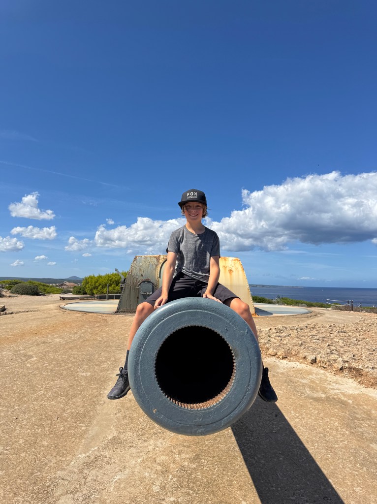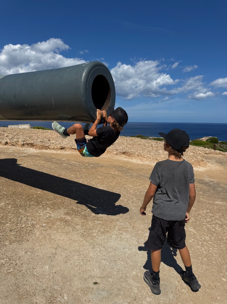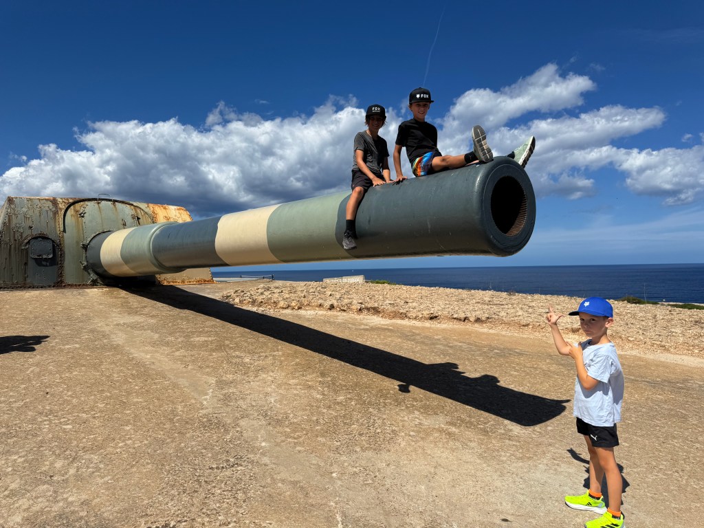Naturally, we had to explore it. And when the boys came face to face with the Vickers 38 cannon—boasting a mind-boggling 35 km range—it was a dream come true for all four of them! Personally, I was more taken with Maó itself: its charming Spanish houses, the tapas, the life that spills onto the streets after 9 p.m., and the warm smiles that greeted the boys everywhere. Of course, they balanced out all that friendliness by scaring the life out of passersby with their scooter stunts (helmets didn’t make it onto Akuna… so yes, my kids are officially growing up in the 80s!).