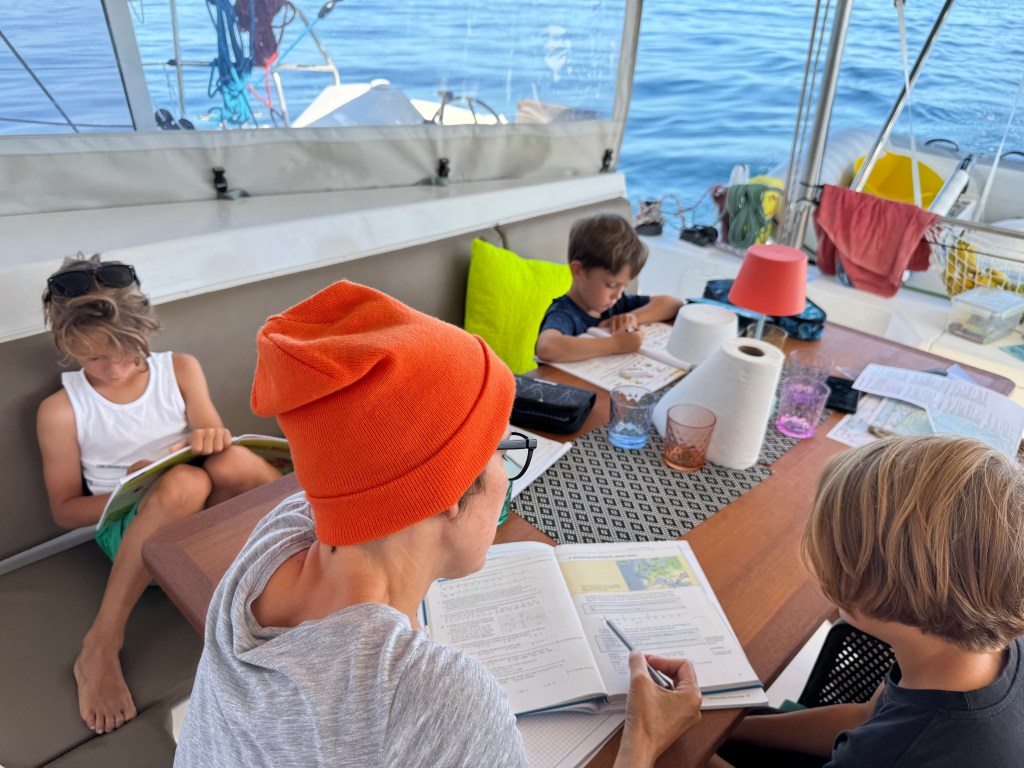 With the calm came a focus on life’s smaller routines — a bit of schoolwork, baking some focaccia for lunch, and the comforting rhythm of an easy day at sea. The boys then invented a “ski simulator,” inspired by talk of Lake Starnberg, winter back home, and a documentary about the Streif. Their laughter filled the cockpit, followed by an enthusiastic session of “muscle training” — they decided the long days aboard were perfect for bulking up.