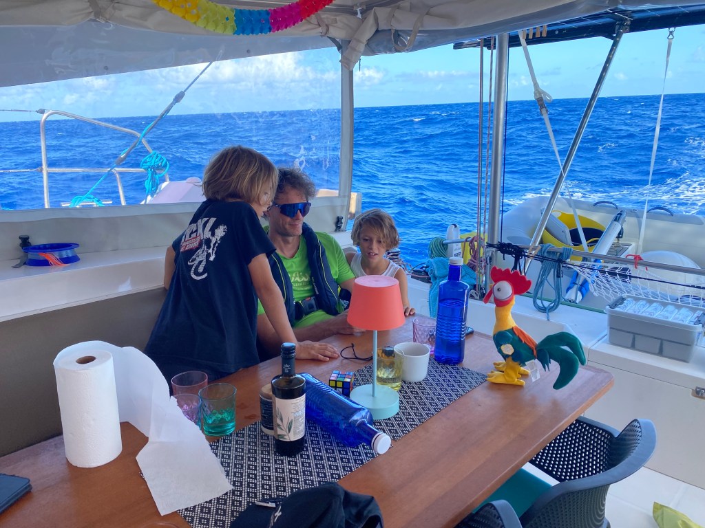We also topped up the batteries using our little generator setup. Normally we rely on our large solar array, but during the crossing the sails sometimes shade the panels, and with the constant motion of the boat, it’s not enough to keep the batteries fully charged — especially since I also cook on induction and run an oven.