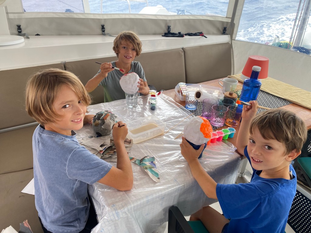 After a looooot of rain—as you saw in yesterday’s video—the breaks between showers slowly grew longer and the wind became a little less erratic. So much so, in fact, that the boys and I even had time for some Christmas decoration crafting. We’d begun a rather makeshift papier-mâché Christmas bauble project a few days ago and continued painting them today.
