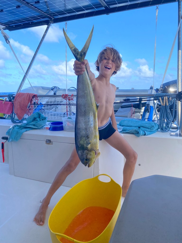 Fishing report: a couple of absolute sea beasts attacked our lures, and we managed to land one respectable mahi-mahi. He will either become dinner tonight or earn early retirement in the freezer.