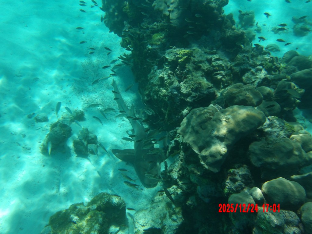 But it did not stop there — soon after, we went out to the reef for a snorkel. We had promised the kids a shark (knowing that these kinds of promises are usually the equivalent of cotton candy… a great thought, but losing substance rather quickly!). However, we jumped off the dinghy, swam to the next coral bommie, and there it was — a 2m nurse shark! Well, what a Christmas present!!!! And what an amazing creature! Snorkeling there was like being in a fish tank… and the boys loved every bit of it!