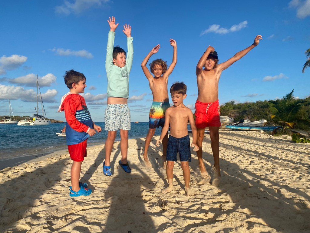 The 24th started with quite a surprise: two classmates — one of Uki and one of Nino — happened to swim right next to our boat this morning!! Together with their parents, of course… well, what a coincidence! We knew they had planned to be in the Caribbean, but meeting on this tiny island!!!?? Crazy!