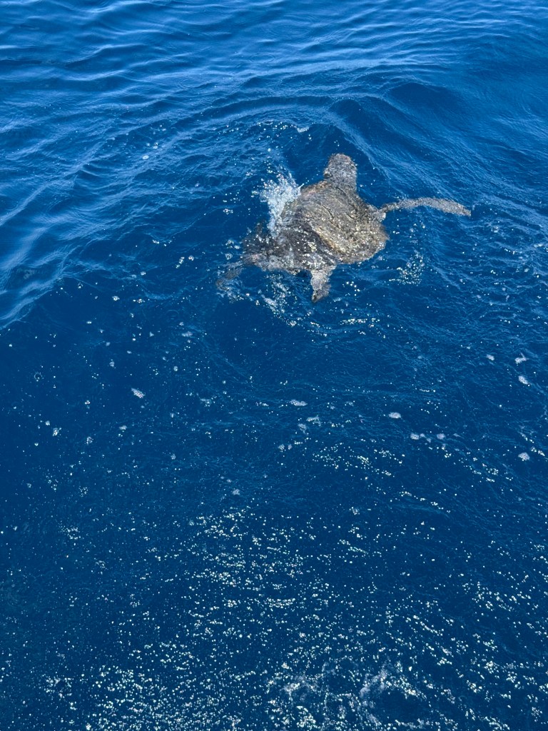 As we drew closer, the wildlife grew more abundant. Enormous sea turtles drifted past (at first we mistook them for floating logs), rays glided beneath the surface, birds circled overhead — and then we spotted our first sea lion.