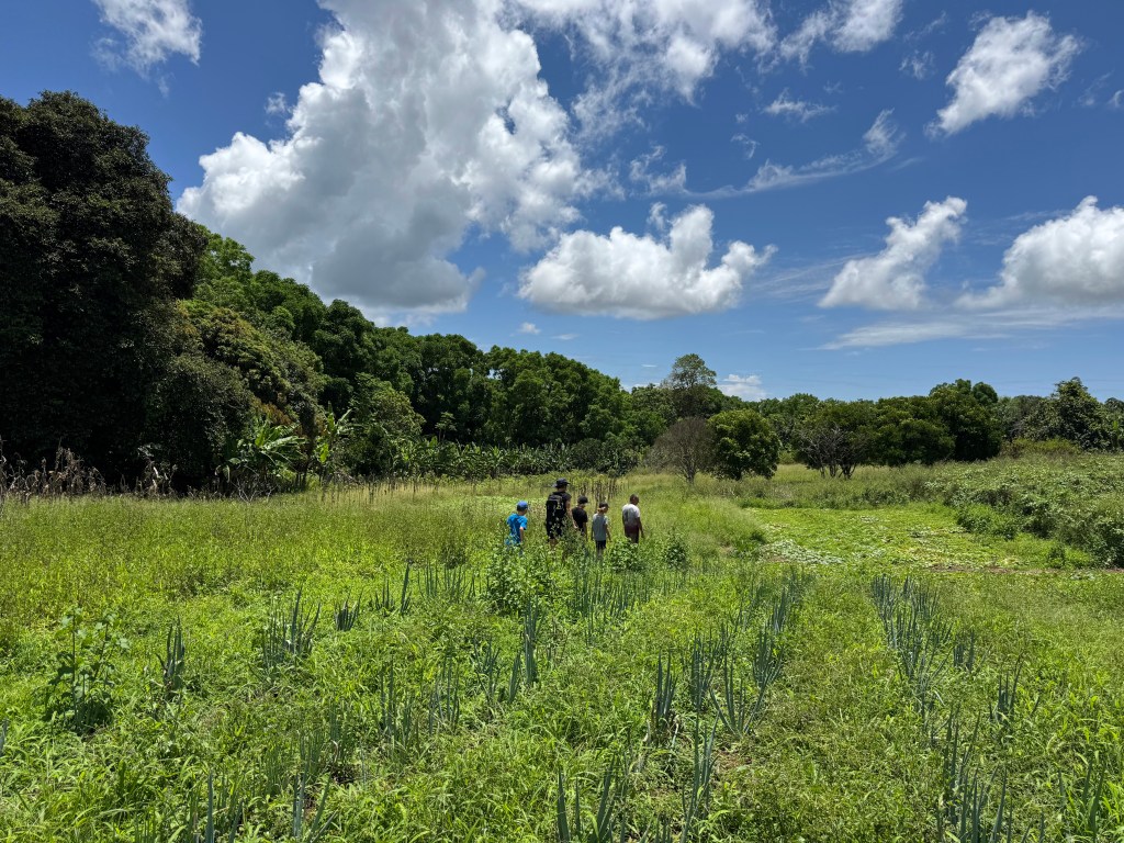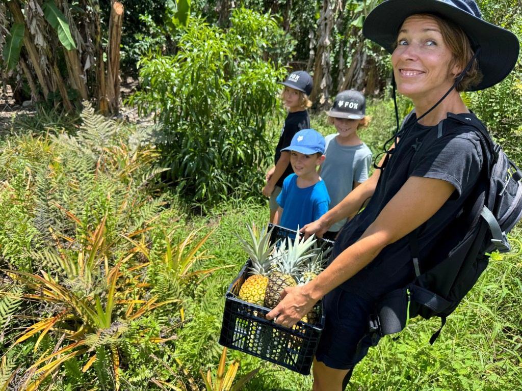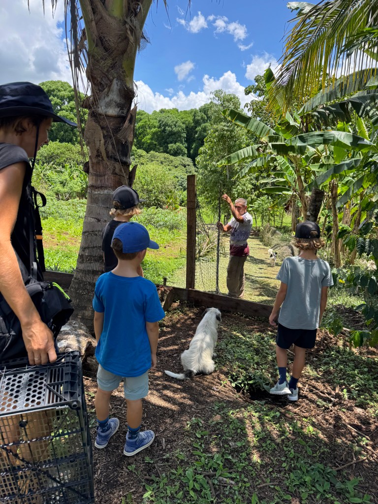 All around us wandered not just chickens, but ducks, geese, cats and dogs — a lively little farmyard. We collected eggs hidden under bushes and fed the chickens with our banana peels (they had never seen any spray here so no danger for them).