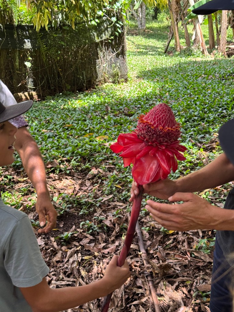 The boys took to it in a way I hadn’t quite expected. Silvio spent so much time explaining all the plants, handing the boys sugar cane to chew on, letting us taste fresh guavas and cutting a huge flame ginger flower for us.