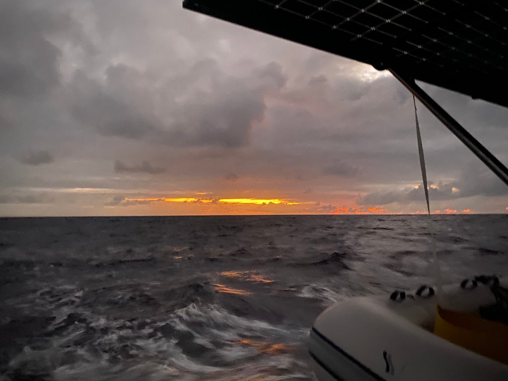 The flying fish have also decided to join the adventure. One launched itself dramatically into the cockpit while Mark was brushing the kids’ teeth, and another kamikaze-dived directly onto my back in the pitch dark. I can confirm this is both highly shocking and remarkably smelly. Thankfully I was wearing my rain jacket, which is now pulling double duty as both weather protection and flying-fish armor.