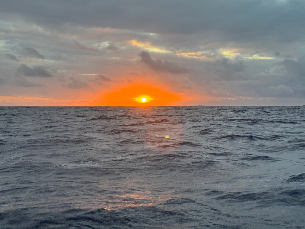 When I came up on deck at 2:00 a.m., the wind had completely vanished. Gone. Disappeared. We’re now running a single engine very slowly to conserve fuel while maintaining steerage against the waves, with a reefed mainsail flapping in protest. We’re hoping the wind returns soon. Mark, understandably, was frustrated—but I’ve chosen to believe that Neptune is simply setting us up for a perfect spinnaker day: calming the seas first, then delivering a steady 15 knots from the east. Neptune and I have an understanding – I am just worried he doesn’t know it yet!