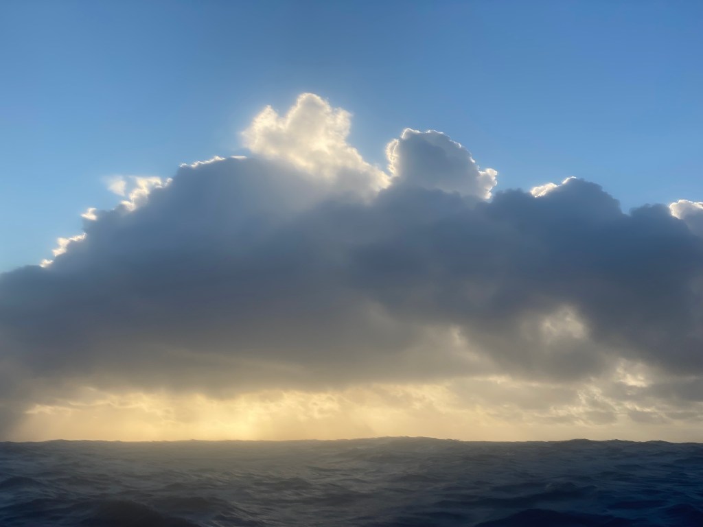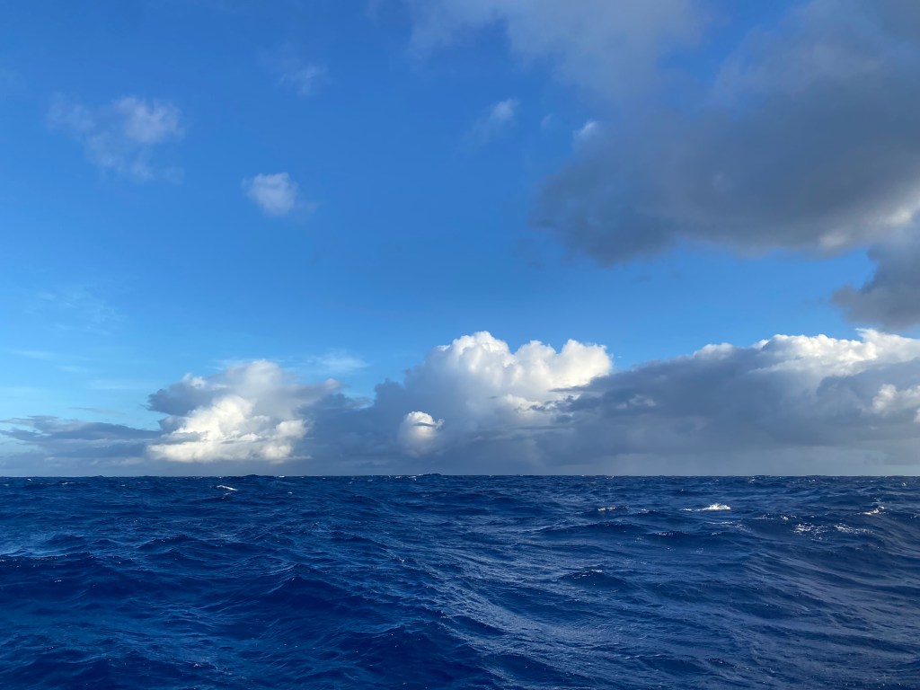 Today, squalls swept through in daylight. Had they not been intent on testing (and occasionally damaging) our boat, they would have been a spectacular sight: towering cloud formations with dense curtains of rain racing across the ocean, as if trying to sweep its surface clean.