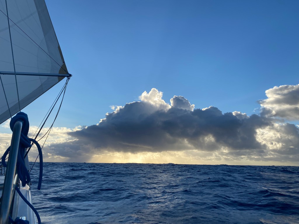 So, no need to lose sleep over it. Still, it was another humbling reminder. As night fell, detecting squalls became more difficult—they only showed clearly on radar once the rain had already arrived, not in that crucial moment before they “switch on,” like the one with the big gust. From now on, if we see even a hint of darkness behind us, we reef early. Yes, we’re slower. Yes, I’ve added another night to the ETA (six instead of five). So far Neptune seems fine with that sending us squalls with hardly more wind in them.