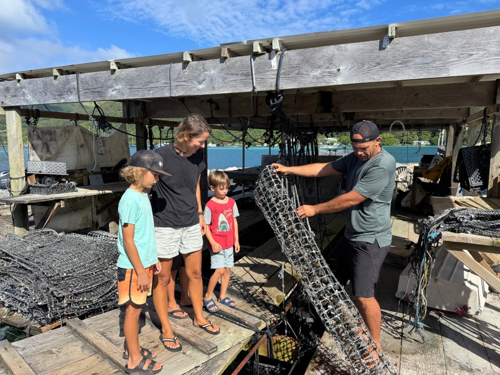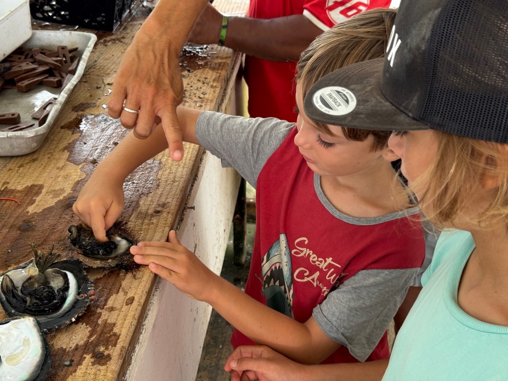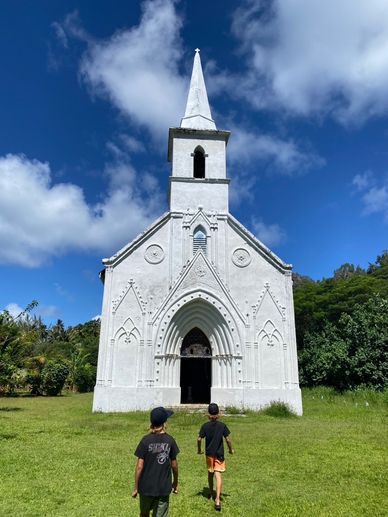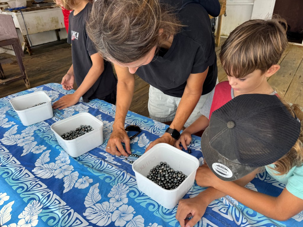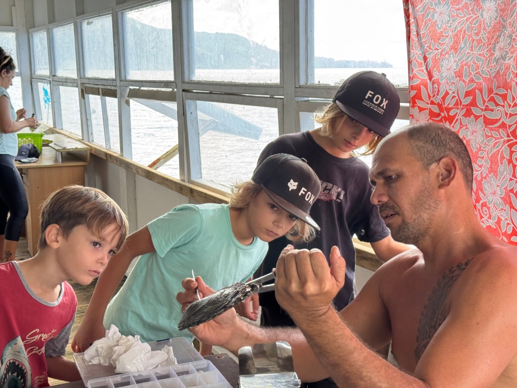 We also visited a black pearl farm—because apparently Mangareva produces some of the best pearls in the South Pacific. Naturally, we now own some (seemed like the logical next step) – and also the boys were allowed to harvest their own from a shell. Seeing how they’re made was honestly mind-blowing. First, the oysters are raised and selected, then after about three years they get their first graft. After that, it’s basically a full-time spa and maintenance program: every two to three months they’re cleaned by hand and even blasted with a pressure washer. All that effort… for something tiny, shiny, and dangerously easy to justify buying.