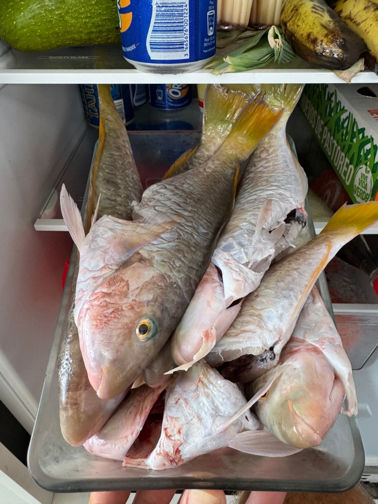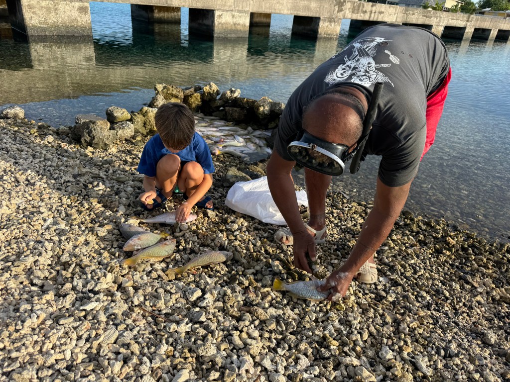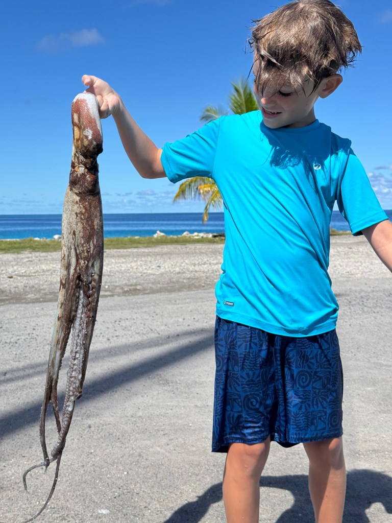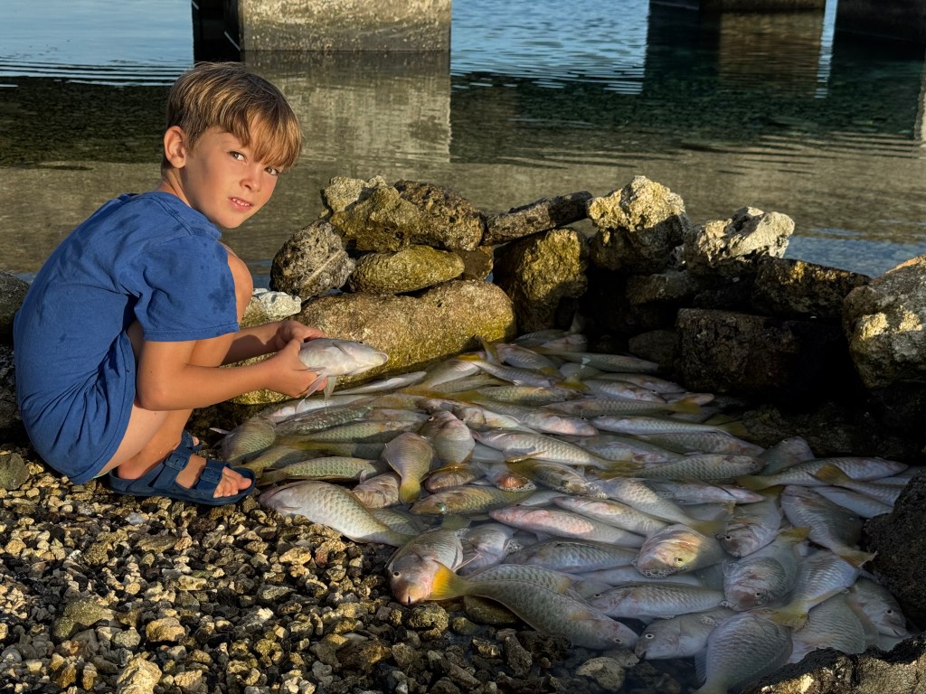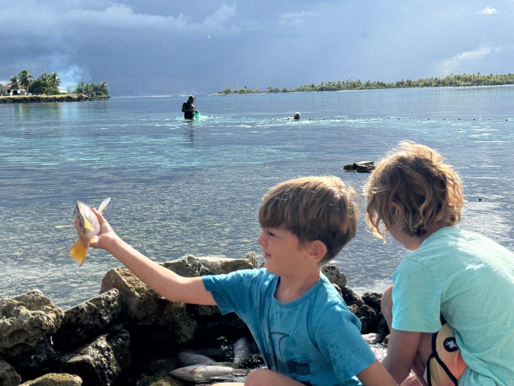 On our very first morning, Nino wandered over to a local fisherman who had caught a net full of small parrotfish. The fisherman had built a simple rock pool along the shore to keep them alive. Nino, curious as ever, began playing with the fish. Back home, he might have been told to leave them alone. Here, the fisherman simply smiled, tossed a fish at his feet, and showed him how to scale it with a shell—and then how to gut it, bare-handed. Six fish later, Nino proudly returned to the boat like a tiny, slightly fish-smelling provider… with lunch.