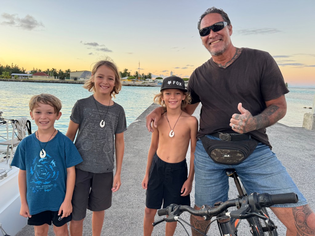 We also visited the local artist Belicot and ordered Matau for the boys. He later delivered them to our boat himself once he had made them specifically for the three. As it turned out, one of the children who had visited us on our first day was one of his ten children—so he already knew about us. Each carving carries its own meaning, and ours were made from sperm whale jawbone, the most valued material for Matau in the Tuamotus. They represent Māui’s magical hook and are said to bring strength, protection, and good fortune.